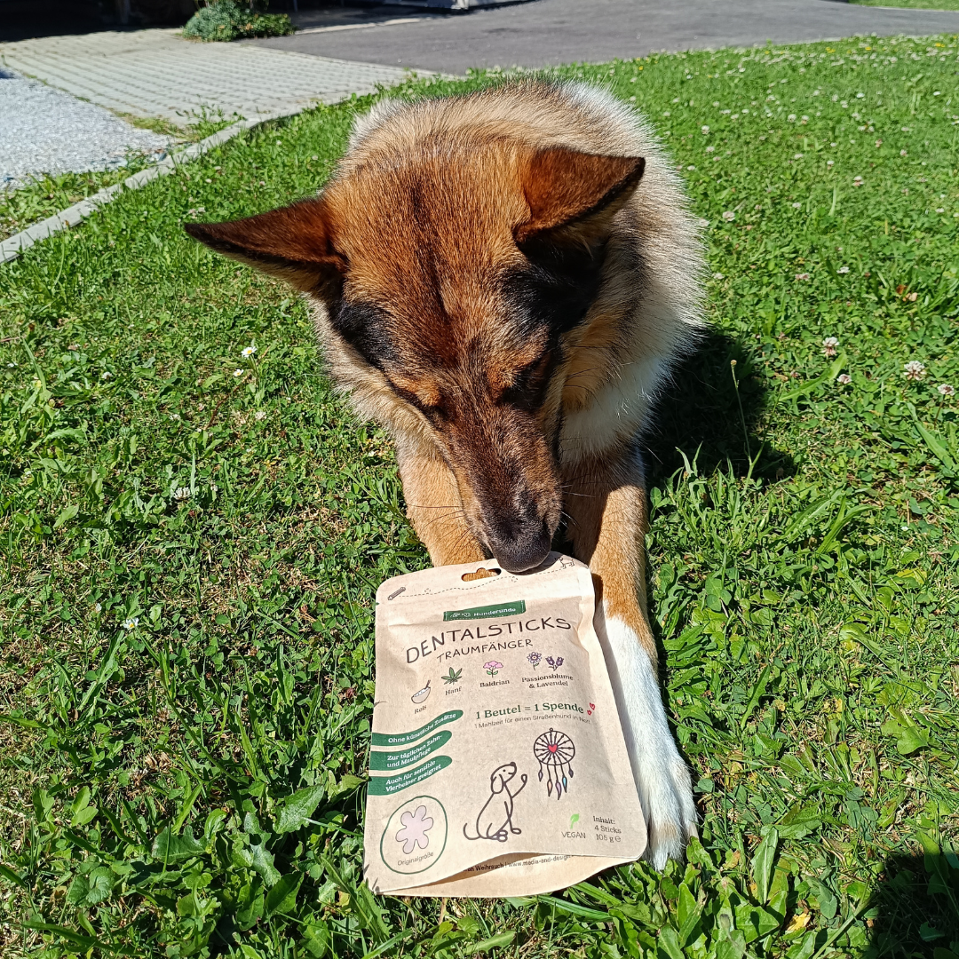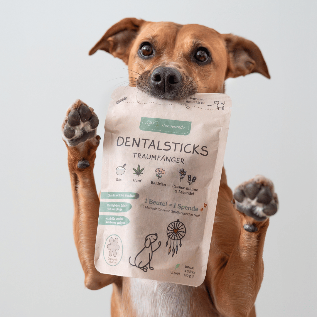 Mit jeder Packung Traumfänger Dental Sticks unterstützt du Hunde in Not. Dein Kauf schenkt einem Straßenhund eine Mahlzeit – eine Belohnung mit Herz.