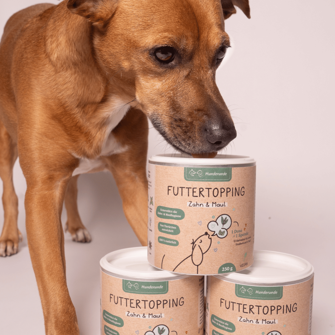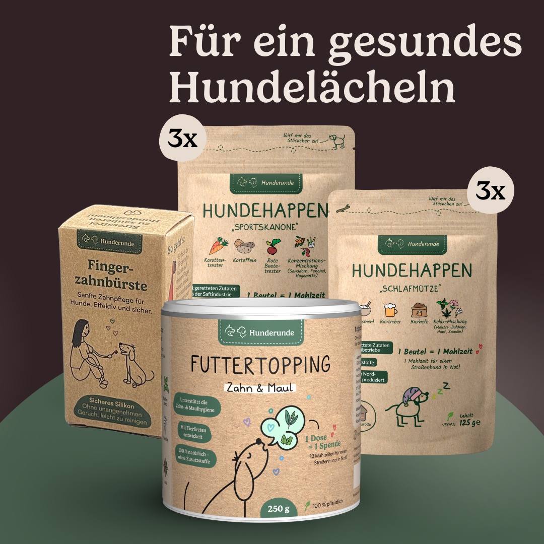 Das Zahn & Maul Set bietet eine ganzheitliche Lösung für die Zahnhygiene deines Hundes. Mit dem Topping, den Dental Sticks und der Fingerzahnbürste kannst du Zahnstein, Plaque und Mundgeruch effektiv vorbeugen – einfach und alltagstauglich.