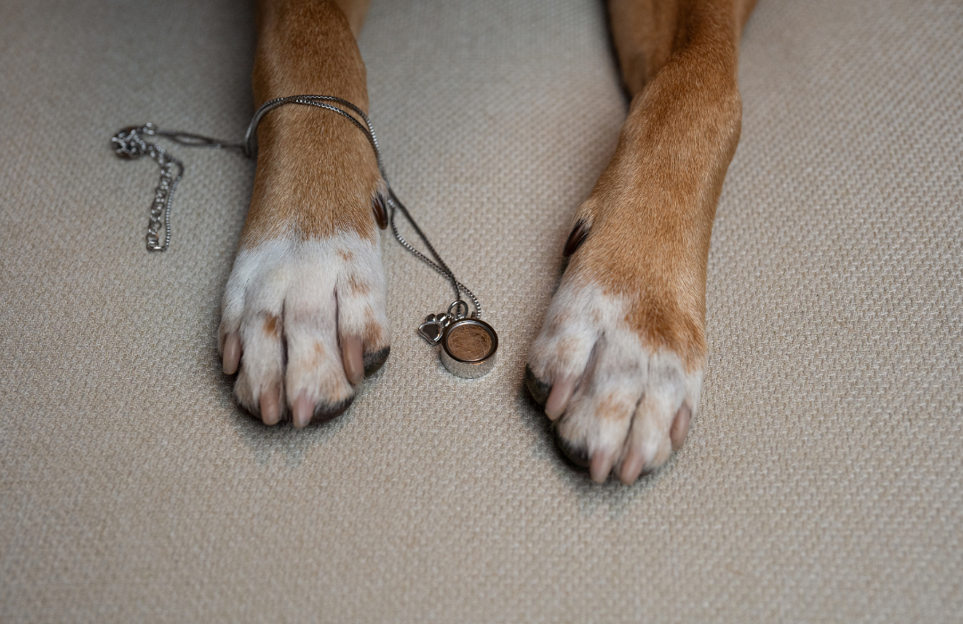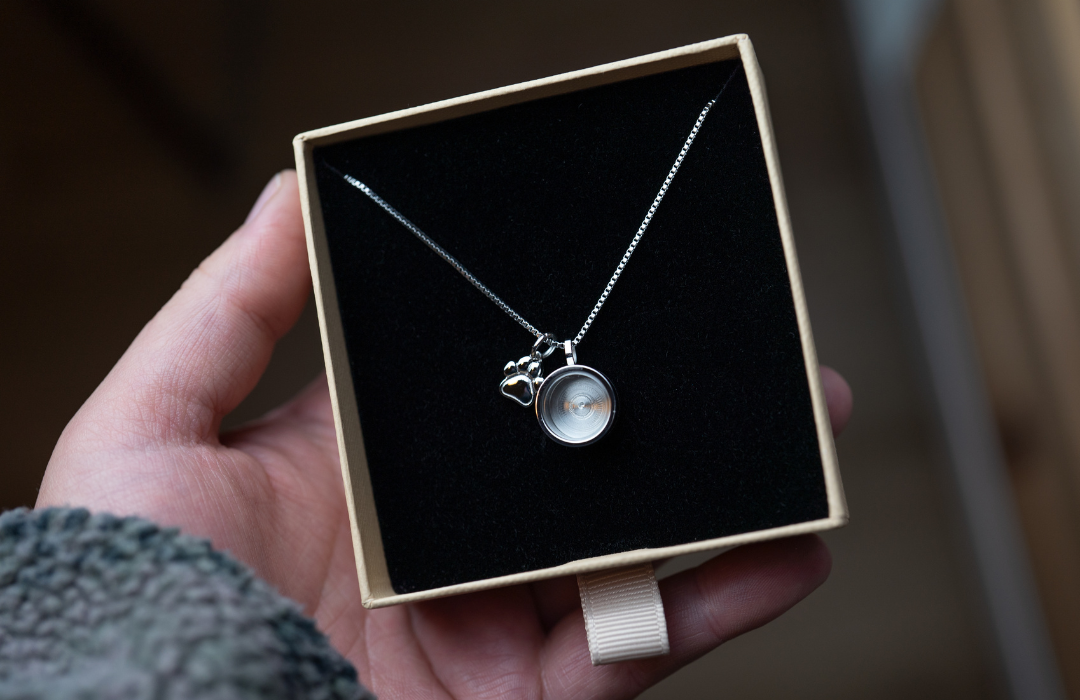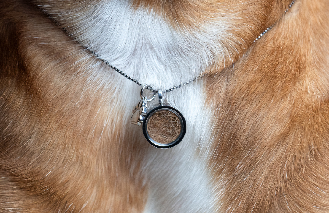 Trage die Erinnerung an deinen Hund nah am Herzen. Die Kette wird mit seinem Fell gefüllt und die Gravur seiner Initialen ist inklusive.