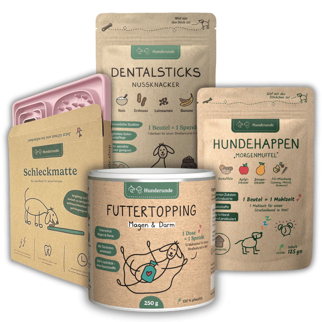 Vom Magen & Darm Topping über die pflanzlichen Snacks bis hin zur Schleckmatte – alles, was du brauchst, um die Gesundheit deines Hundes zu fördern, ist in einem Set vereint. Dabei sparst du nicht nur Geld, sondern auch Zeit, da alle Produkte perfekt aufeinander abgestimmt sind.