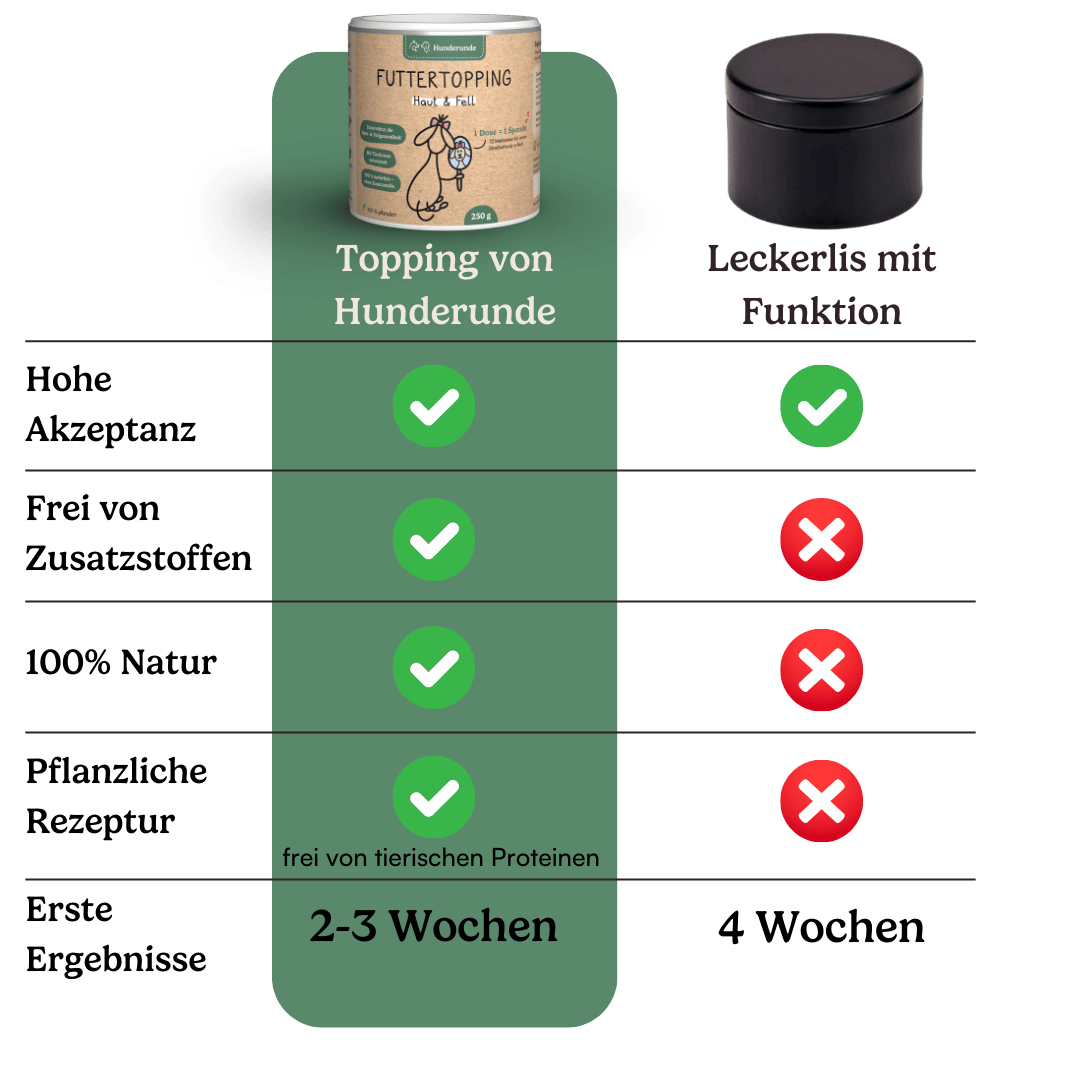 Mit 100% funktionalen Inhaltsstoffen und ohne jegliche Zusatzstoffe bietet unser Futtertopping die reinste Unterstützung – für eine gesunde und natürliche Pflege. Weil die Gesundheit deines Hundes zählt.