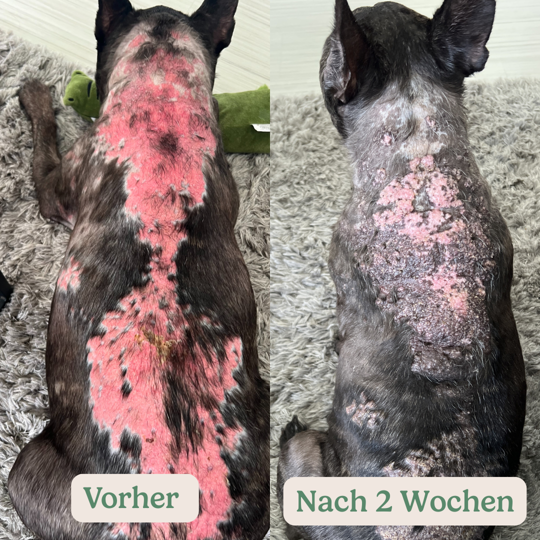 | ab 28 | 0,3 g / Körpergewicht pro Tag | Allmählich solltest du erste positive Veränderungen bei deinem Hund bemerken. |